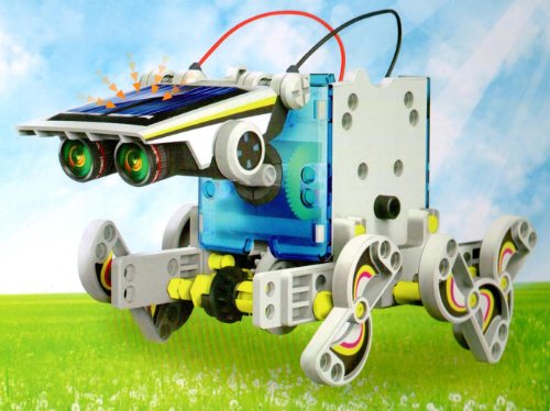 The solar powered robot can be transformed into 14 different robot modes that include a multitude of comical and functional movements. Easily change from a wagging-tail dog - running beetle - walking crab - surfer - speedster - zombie chaser and more. The robot kit provides unique accessories and parts that make robot move on land or water or both. With alternative energy playing such a pivotal role, there is no better time than now to start children on the path to learning basic concepts behind these technologies. Fortunately, all the 14-in-1 robots are powered by the sun, so no batteries required. The robot moves in direct sunlight and allows children to create and use their infinite imagination. There are two levels in building robot version. Level One includes: Turtle-bot, Beetle-bot, Quadru-bot, Boat-bot, Walker-bot, Dog-bot and Wheel-bot. After children explore entry level designs, they can challenge their manipulative skills with Level Two projects: Roly Poly-bot, Auto-bot, Slither-bot, Surf-bot, Zombie-bot, Crab-bot and Row-bot. Additional features include: adjustable polarity on the solar panel to change direction of motor rotation, retractable robot head which can be quickly stored in the upper body, the robot head can be installed in the front, top or rear of the gearbox and transparent housing to see the movements of the gears. As we all say, ""Our children are the future"". And if anything is certain about that future, it is that renewable energy sources and green technologies will play a major role in our children's lives. With 14-in-1 Educational Solar Robot Kit, let them learn about their future and have fun at the same time.