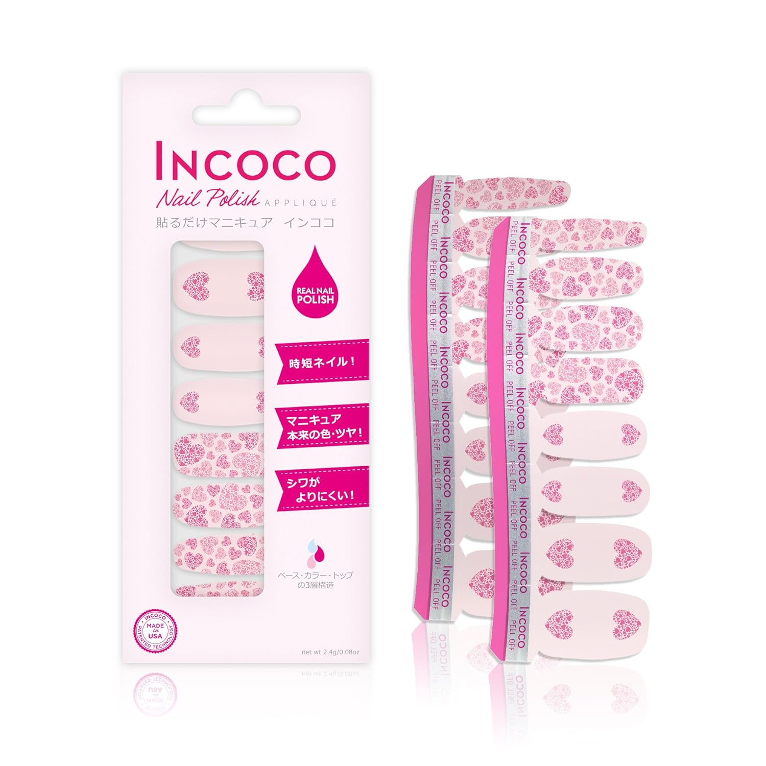 アメリカ生まれの貼るだけマニキュア 「インココ・ネイル・ポリッシュ・アップリケ」(Incoco)はマニキュア成分でできたシートタイプのマニキュアです。乾かす時間不要、塗りムラ知らず、且つマニキュアならではの発色やツヤを楽しめます。インココでまったく新しいマニキュア体験をしてみませんか!パールピンクでハートモチーフのデザインネイル。ちょっとラブリー&ガーリーに決めたい日にオススメです!