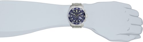 Amazon.com Classic chronograph styling with contemporary features, the Invicta Men's Pro Diver Collection Chronograph Stainless Steel Watch features a brushed and polished stainless steel case and a band that closes with a fold-over safety clasp. The stainless steel case provides an ideal foundation for this watch's rotating bezel with minute markers and its attractive blue dial. The dial has luminous hands and hour markers, and three subdials at the two, six, and 10 o'clock position. There's also a magnified date window at the four o'clock position to help you keep tabs on your busy schedule. For added design, Invicta included a large crown and two bold buttons on the right-hand side of the case. Other features include precise Swiss quartz movement, a durable flame-fusion crystal, and water resistance to 660 feet (200 meters). 0