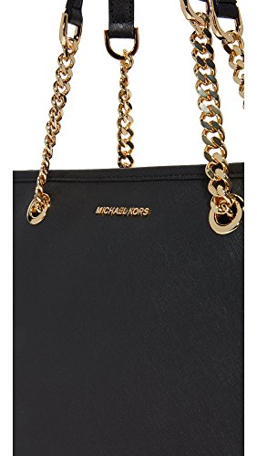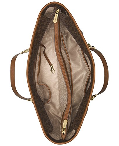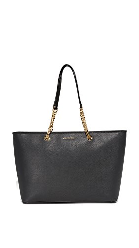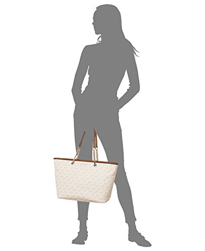 -. Brand : -. Department : womens -. Feature : MK Signature PVC; lining: polyester / Exterior features gold-tone hardware and logo plaque / Interior features lining, center padded zip compartment, 1 zip pocket, 3 open pockets and 1 cellphone pocket / 11"L double handles / Large sized bag; 17"W x 10-1/2"H x 6"D -. ProductGroup : Shoes -. ProductTypeName : HANDBAG -. Size : Large -. Title : MICHAEL Jet Set Travel Chain Large Top Zip Multi Function Tote