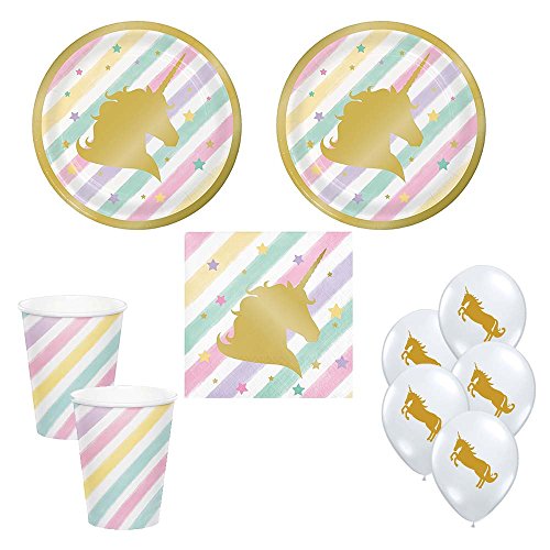 -. Feature : Serves 16 guests: / 16 ct - small dessert paper plates 7" - Each P.R.Inted paper plate has a beautiful Gold Foil stamped unicorn. / 16 ct - beverage size napkins - Each P.R.Inted napkin has a beautiful Gold Foil stamped unicorn. / 16 ct - 9 oz cups / 5 ct - 11" helium quality latex balloons - Diamond Clear with gold ink