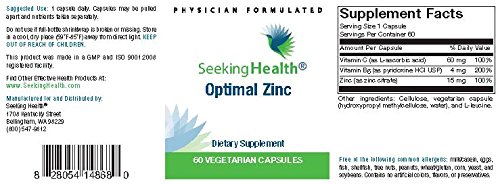 -. Binding : Health and Beauty -. Brand : Seeking Health -. EAN : 0828054148680 -. Feature : Optimal Zinc uses zinc citrate, the natural form of zinc that is found in human milk. Vitamin B6 and ascorbic acid have also been added to facilitate zinc metabolism. / Zinc is an essential mineral that activates more than 70 enzymes, including those that assist with protein synthesis and wound healing. / Free of Inulin or FOS, Streptococcus, Casein, Corn, Dairy, Egg, Fish, Gluten, Peanuts, Shellfish, Soy, Tree Nuts, Wheat. -. Label : Seeking Health -. Manufacturer : Seeking Health -. MPN : 025-05-001-57 -. PackageQuantity : 1 -. PartNumber : 025-05-001-57 -. ProductGroup : Health and Beauty -. ProductTypeName : HEALTH_PERSONAL_CARE -. Publisher : Seeking Health -. Studio : Seeking Health -. Title : Optimal Zinc | 100% Natural Zinc With Vitamin C And Vitamin B6 | 60 Easy-To-Swallow Vegetarian Capsules | Free Of Common Allergens | Seeking Health -. UPC : 828054148680