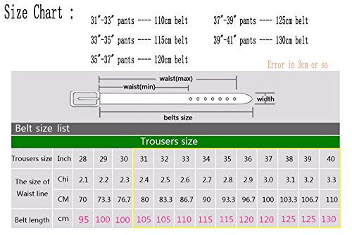 REGITWOW Belt size chart for reference 31"-33" pants ---- 110cm belt 33"-35" pants ---- 115cm belt 35"-37" pants ---- 120cm belt 37"-39" pants ---- 125cm belt 39"-41" pants ---- 130cm belt Error in 1-3cm or so. To understand what length best suits you, measure your waistline while wearing the pants you would like to use the belt with. Or, you can choose the belt size based on the size of your pants. Product Details Brand Name:REGITWOW Item name:Men's Belts Target:Adult,Teenager Suitable: men(male) Style: fashion belts/cool belts Occasion:casual,business,formal Travel and any occasion. Belts Material:cow genuine leather(Cowskin) Belts Length(full length of belt strap):110cm,115cm,120cm,125cm,130cm Belts Width:3.5 cm Belts color:black(Solid color) buckle material:alloy buckle(Metal) Buckle Length:about 9 cm Buckle Width:about 4.5 cm buckle color: black, tungsten(Gun color) Length Can Trim There may be some difference because of different dressing habits. If you are not sure about your size, You can choose a long REGITWOW belt and trim it to fit, just need a pair of scissors. If the belt is too long, please trim the belt as following method: (1)Open the active teeth and tkae off the belt(Scissors or screwdriver) (2)Measure your waist and cut off the extra belt (3) Put into the buckle and press on the teeth Warm tips (1)As the shooting light, angle and color displays, objects and photos maybe some differences. (2)Due to manual measurement,Have 1-3cm Error,Please kind prevail. Package Including mens leather belt x 1 , Excellent Gift box x 1. 0 |