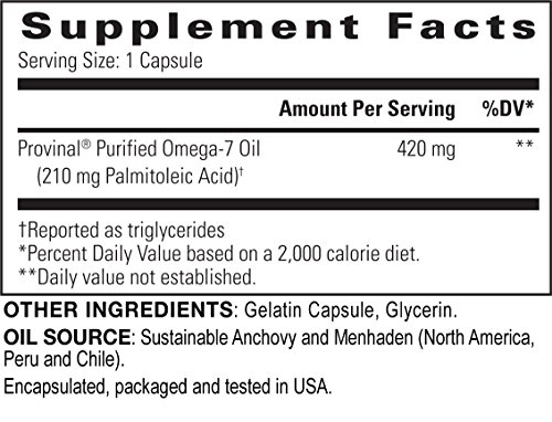 A Concentrated & Purified Omega-7 (Palmitoleic Acid) source derived from fish. 210 mg Palmitoleic Acid triglyceride form omega-7 per dosage. Just one small powerful pill daily.
