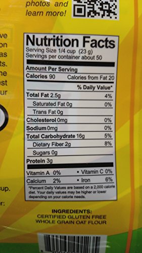 Whole grain, certified Gluten Free, Oat Flour. 100% whole grain, natural oat flour for use in your favorite recipes. Taste the difference of our uncontaminated, fresh roasted flavor that comes from our steamed, shelf stable processes. Two pack = 2 of the 2.4 lb bags (40 oz / 1.133 kg)