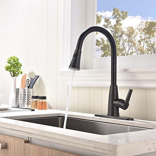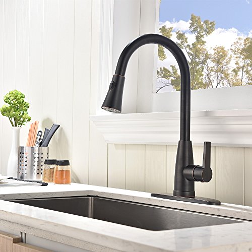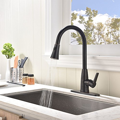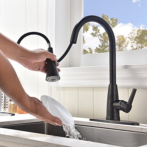 [Upgraded Version]Friho Antique Brass High Arch Single Lever Pull Down Black Oil Rubbed Bronze Pull Out Spray Kitchen Sink Faucet, ORB Kitchen Faucets With Sprayer and Escutcheon