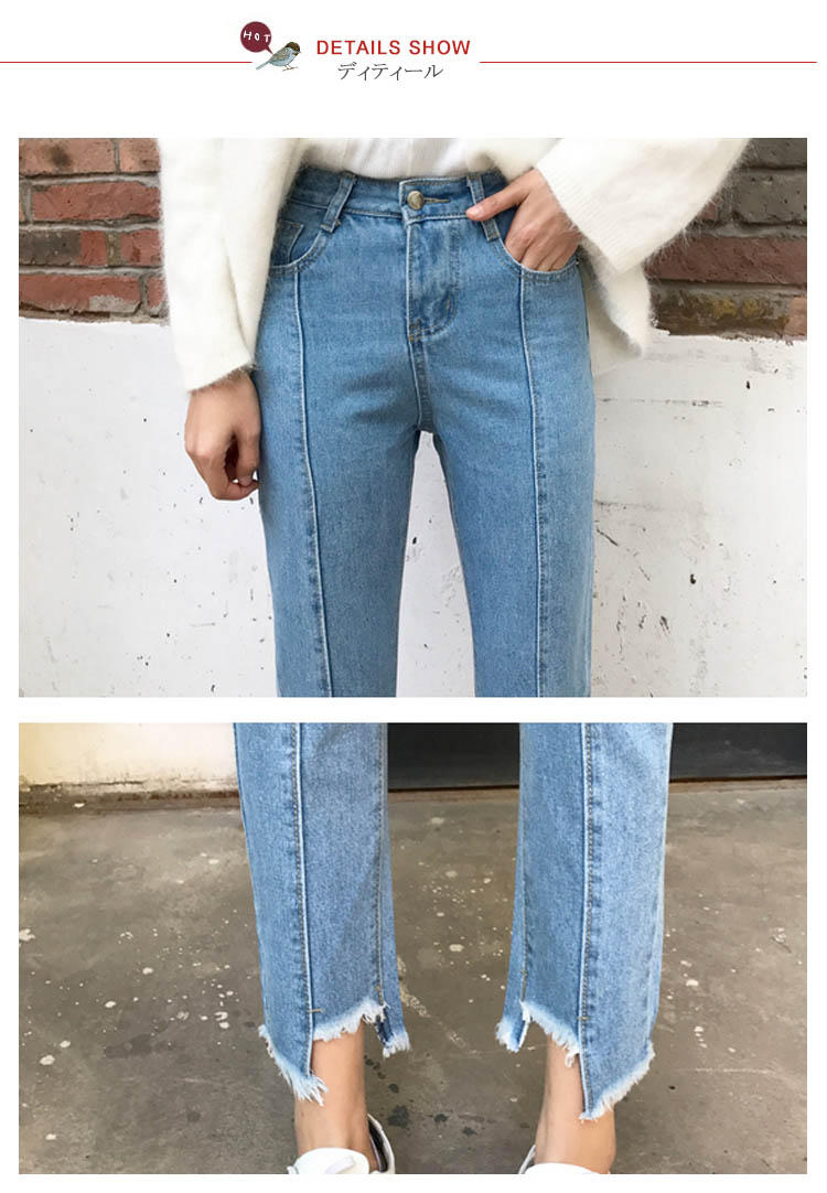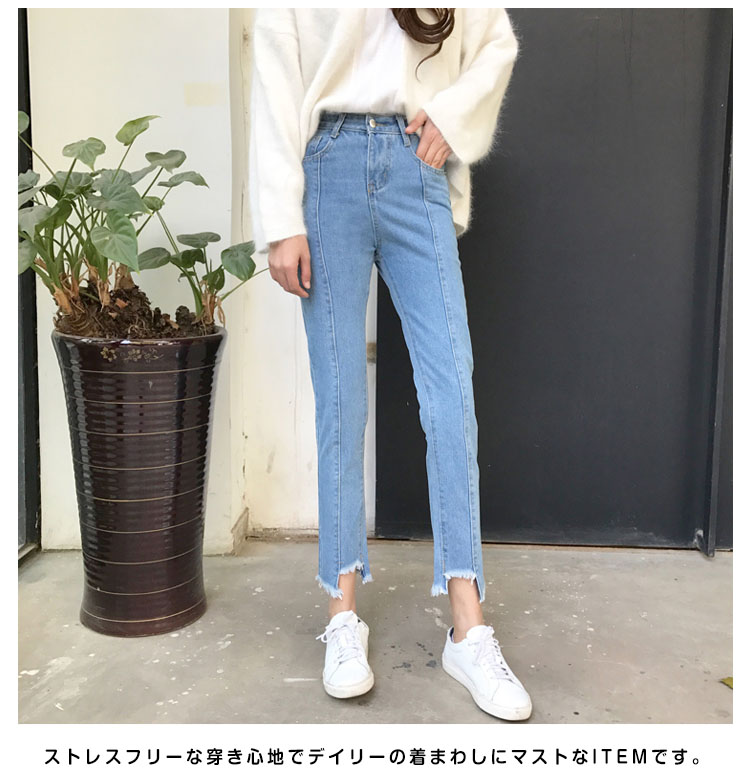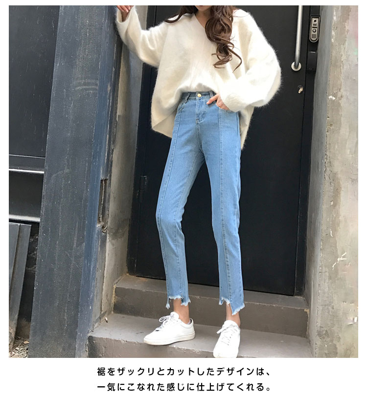 | ラフな切りっぱなしが今年っぽい。オシャレ女性に欠かせない裾カットオフデニムパンツが誕生。裾をザックリとカットしたデザインは、一気にこなれた感じに仕上げてくれる。ストレスフリーな穿き心地でデイリーの着まわしにマストなITEMです。 | |