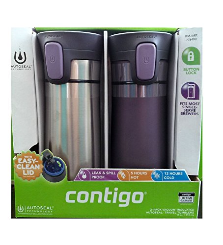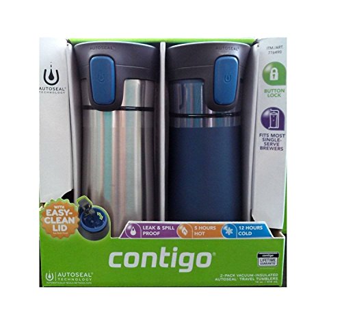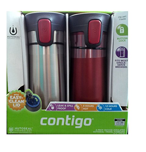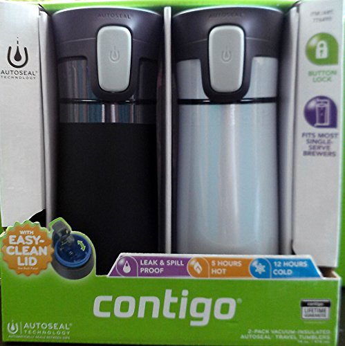 Take your favorite beverage along with you-wherever you go-without the risk of leaks or spills. The Contigo AUTOSEAL® Pinnacle Stainless Steel Travel Mugs - 14oz double wall stainless steel travel cup with patented Locking auto-seal lid. Press to sip. Release to seal. The lid automatically keeps your beverage from leaking or spilling. The tumbler holds up to 14 ounces of your favorite beverage and will fit most standard car cup holders. Its vacuum insulated technology keeps beverages hot for five hours and cold for twelve. Not intended for carbonated beverages or boiling liquids. Hand wash using non-abrasive cleaners. The lid is top Rack Dishwasher Safe - Easy Clean travel mug lid. Recommended to hand wash the body. (2 Pack 1 Stainless and 1 White) - Two Stainless Steel Auto Seal "Pinnacle" Stainless Locking Tumblers. 100% leak-proof. Those are pretty bold claims, but they are what AUTOSEAL® is all about. Need a leak-proof travel mug to use in the car? Need a spill-proof coffee mug to use at your desk? Need a travel mug that will keep your coffee hot for hours? How about all of the above? AUTOSEAL® has you covered. The Stainless Steel AUTOSEAL® Mug has a double wall and is vacuum-insulated, ensuring that your hot coffee or other beverages stay that way for hours.