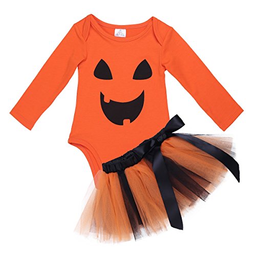 -. Feature : Set Include: 1Pc Romper, 1Pc Tutu Skirt / Toddler girls' adorable cotton pumpkin halloween cosplay outfits / Long sleeves and ruched shoulder romper, front with a pumpkin pattern / Tutu skirt with elastic waistband and irremovable ribbon bow at waist / Suitable for Halloween, cosplay party, photos, holiday or daily wear