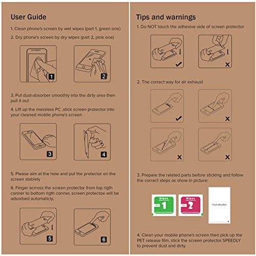 - Feature : FULL SCREEN PROTECTOR: 3D Curved Edge Design Full Coverage. Precise dimensions provide maximum protection for the entire touchscreen surface of your iPhone 6 /6S 4.7", fitting its curved edges / HIGH-RESPONSE & HIGH-TRANSPARENCY: High light penetration ratio, plus the perfect adhesion, preserves the original viewing quality and maintains the original touch experience It is coated on the back with a strong silicon adhesive that makes installation easy and attaches the film firmly so as to not affect the touch screen's sensitivity / PLEASE NOTE: This is not the original tempered glass screen protecter, The correct way for air exhaust: please go begin at the top or the bottom of the phone,please see the tips picture on the right of the monitor. If you fail, please move it, and try again. / ULTRA SCRATCH PROTECTION: Premium tempered glass effectively resists scratches thanks to 8~9H hardness rating / ANTI-SHATTER FILM: If broken, breaks into small pieces that are not sharp, making it safer than other glass products
