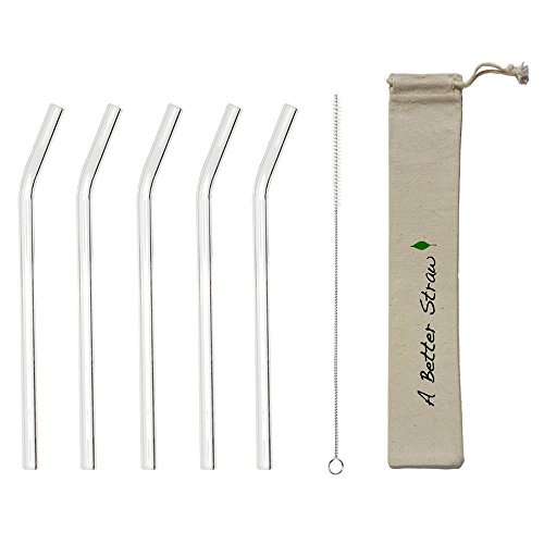Reusable Straws - 5 Pack Clear Bent Glass Straws + FREE Cleaning Brush + Eco-friendly Carrying Pouch - Premium Glass Straws by A Better Straw