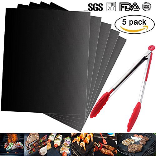 DOHOT Reusable Heavy Duty Non-stick Barbecue Grill Mat,Durable Heat Resistant Cooking BBQ Mat with Grill Tong - FDA-Approved,PFOA Free,Easy to Clean,(5 Pack with Grill Tong)