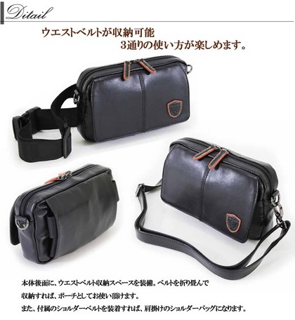 1、ポーチ 2、ウエストバッグ 3、ショルダーバッグ  用途に合わせて3通りのスタイルを楽しむ事ができます。