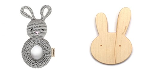 This gift set is the perfect gift for a new baby or expecting mama. Give the gift of worry free toys with this organic and natural rattle and teether set.The easy to grasp rattle is lovingly hand-crocheted using soft 100% organically grown and sustainably harvested bamboo. Bamboo yarn is soft, naturally antibacterial and non-allergenic. The bunny Rattle is approximately 6" tall and will make a cute and eco-friendly gift. Bamboo is also a renewable, sustainable resource.