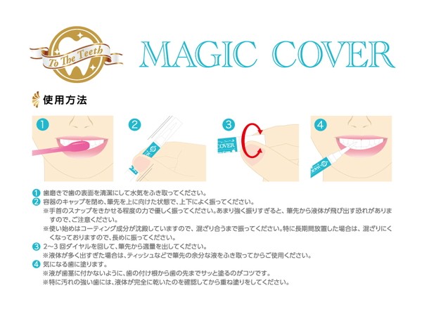 キャップは必ず音が鳴るまで閉めてください。キャップを外したまま放置すると、液が乾燥して出なくなりことがあります。 湿度が高いところや低いところ、直射日光が当たるところには置かないでください。 歯、口内炎、口内粘膜に異常がある方、知覚過敏の方、アルコールアレルギーの方は使用しないでください。 傷やはれもの、しっしん等、異常のある部位にはお使いにならないでください。 目に入ったときは、直ちに洗い流してください。 歯に液を塗布後、カレーなど色の濃い料理を食べると着色してしまう恐れがあります。 液が着衣などに付きますと落ちにくいのでご注意ください。 着衣についてしまった場合は、着衣に応じた方法で洗浄してください。 歯以外には使用しないでください。 歯の噛み合わせ部分には、摩擦によってコーティング成分がとれやすくなりますので、ご使用をお止めください。 万一、歯や口内粘膜等に異常があらわれた場合は、使用を中止して、医師にご相談ください。 乳幼児の手の届かないところに保管してください。 火気にはちかづけないでください。 |