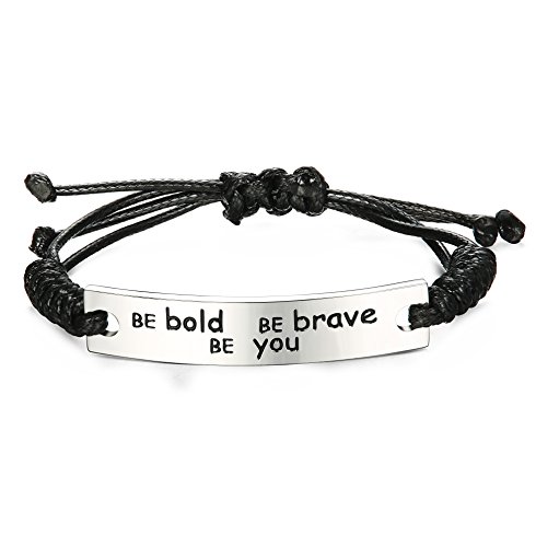 -. Feature : シンプルなレザーブレスレットです。シルバーテンレスの飾りに「Be bold Be brave Be you 」の刻印があり、「勇気のある自分になれ」という励ましい意味で、お洒落なアイテムです。自分やご家族、お友達へのプレゼントとしてお薦めです。 / 素材:レザー&ステンレス。柔らかい革を採用しておりますので、つけ心地が良いです。ステンレスも変色やサビしにくく、長持ちできます。ストレッチのデザインで、長さが適当に調整できます。男女ともお使いいただける一品です。 / 商品をちゃんと収納できるように、収納ポーチを提供いたします。もちろん、プレゼントとする時にも、余計な包装もいらなく、このまま渡すのもよいです。 / 素材のサージカルステンレス 316Lは医療用の器材などに使われてます。ゴールドやシルバーと違い、サビにくく、腐食・酸化・高熱に強い素材です。高い硬度を誇り、金属本来の美しい輝きを保ち続けることが可能です。金属アレルギーの方でもつけやすく、メンテナンスもほとんど必要がないので、ジュエリーやアクセサリー業界で現在もっとも注目されている素材です。 / 【商品保障】ご購入日より365日の商品保障を提供いたします。期間内、無条件にご注文の返品・交換をお受け取りいたします。ご注文商品到着後、何か問題がありましたら、いつでもお気軽にご連絡ください。(※365日の商品保障は「義烏市安華マフラー商行」によって提供しております。ご注文になる際に、販売者名は「義烏市安華マフラー商行」であることをご確認ください。他の不正販売者にご注意ください!)