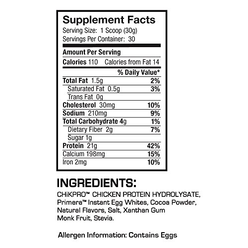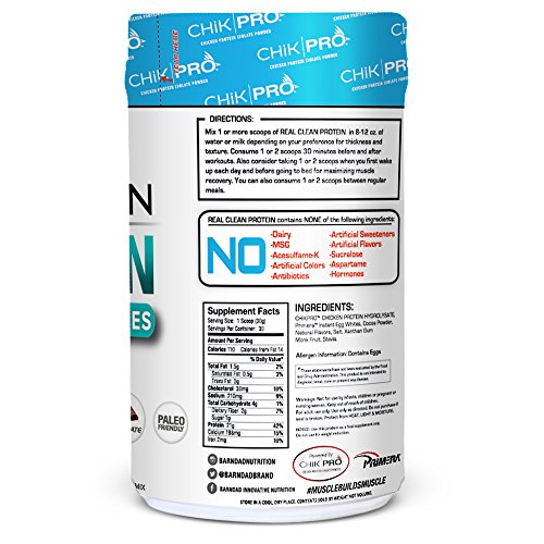 -. Feature : 21 Grams of all Natural Chicken Isolate and Egg White Protein. Powered by ChikPro / Real Clean Protein contains all of the essential Amino Acids and BCAAs the human body needs for health, muscle growth, strength and recovery / EASY TO BLEND: Our easy-to-mix formula simplifies getting your protein on the run, in the gym, or at home / Nourishing and Delicious Creamy Smooth Chocolate / DOES NOT CONTAIN: Dairy, Antibiotics, Hormones, Artificial Sweeteners, Artificial Flavors, Artificial Colors, MSG