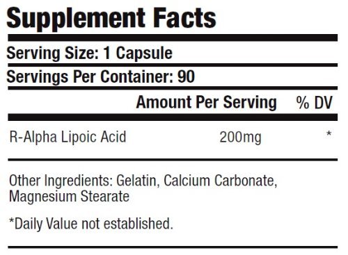 Each bottle contains 90 capsules. Product contains: R-Alpha Lipoic Acid 200mg per capsule.