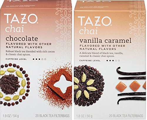 -. Feature : 1 x Tazo Chai Chocolate Tea, 20 Filterbags (black tea + cardamom + black pepper + cinnamon + ginger + cocoa peels + yerba mate) / 1 x Tazo Chai Vanilla Caramel Tea, 20 Filterbags (black tea + black pepper + cinnamon + ginger + vanilla extract + caramel) / Robust black tea blended with rich cocoa and classic chai spices. / A delicate blend of black tea, vanilla, caramel and classic chai spices.