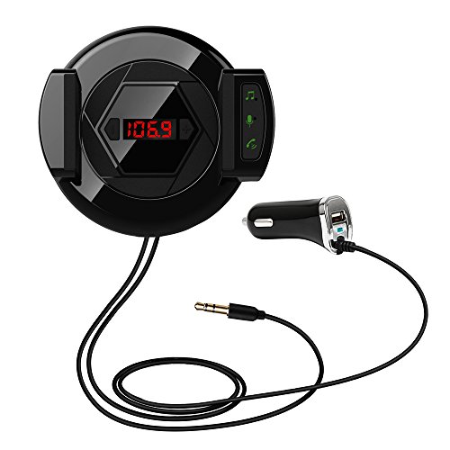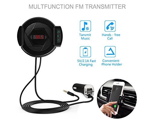 E-Bro Bluetooth FM Transmitter,Hands-Free Calling Car Kit with 3.5mm Aux Input Jack Phone Holder and 2.1A USB Port Car Charger