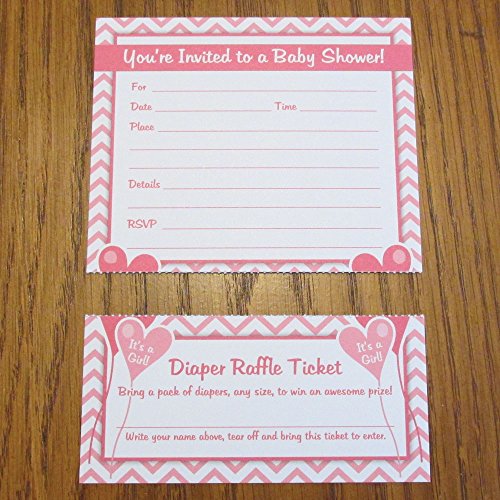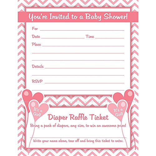 Girl Baby Shower Invitations with Diaper Raffle Ticket (Set of 25 with Envelopes)