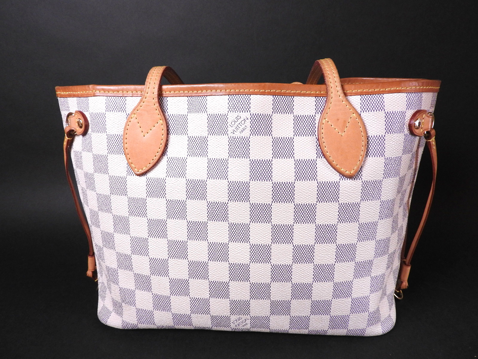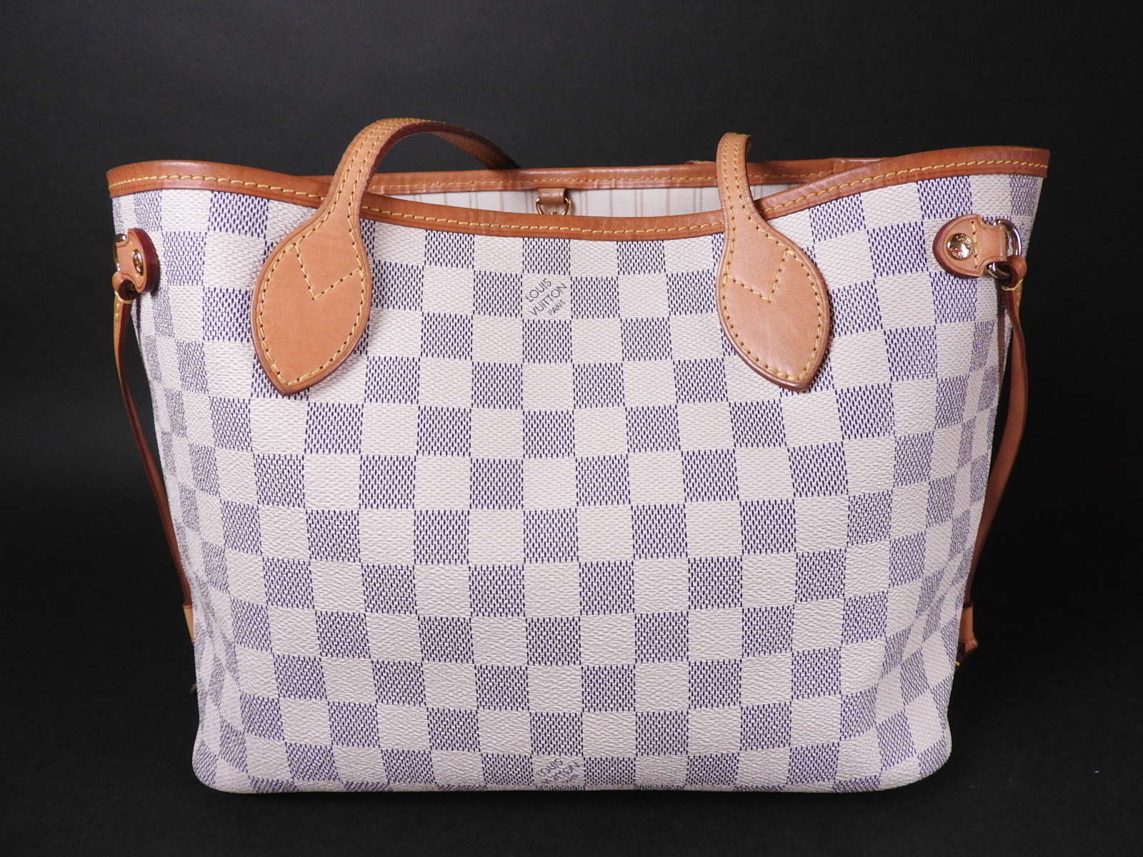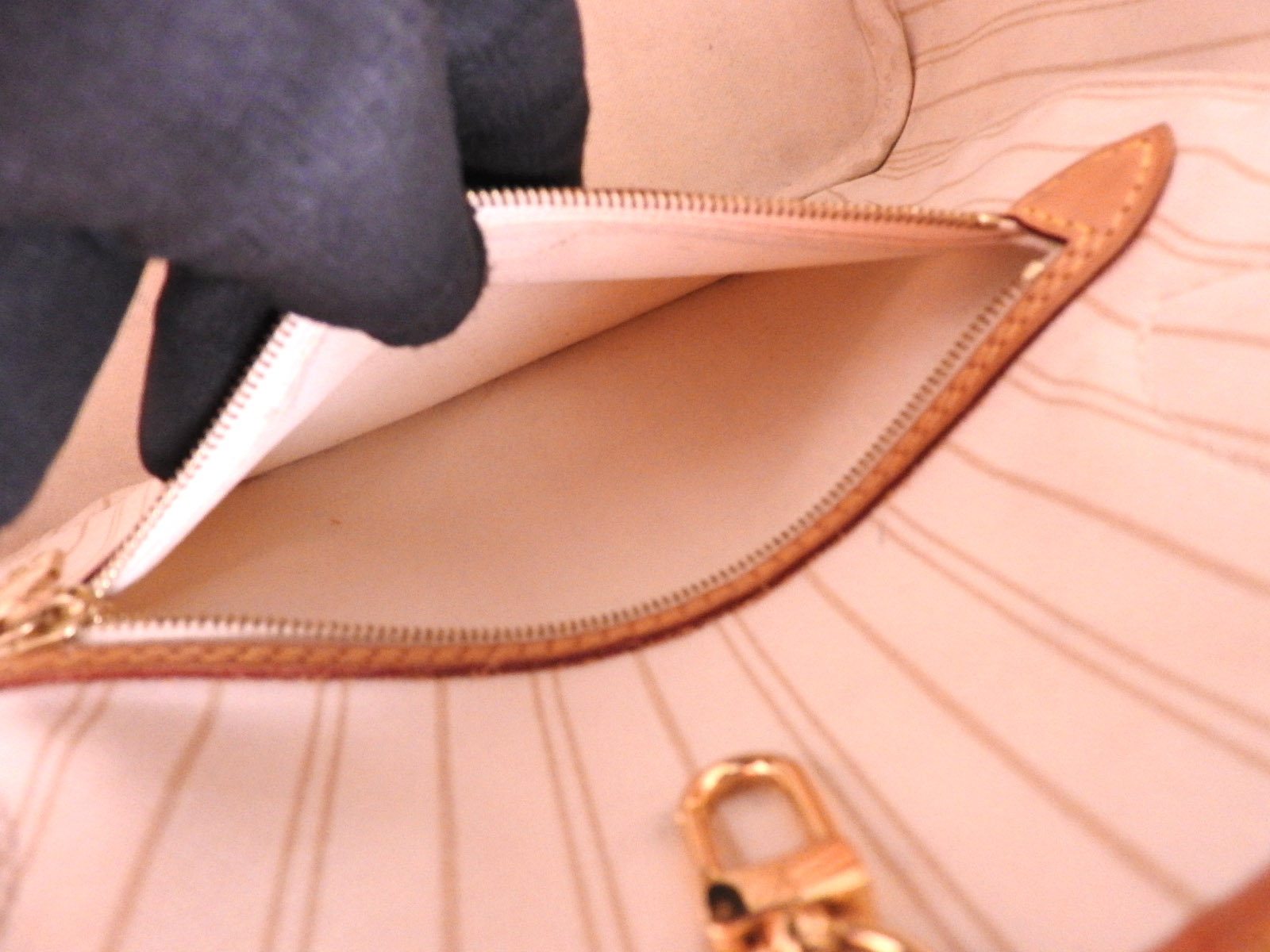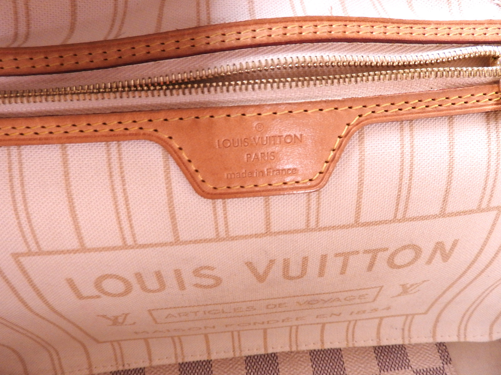 | Exterior | Damier azur: Slightly used feeling. Slightly stained and tanned. Leather: Used feeling. Some stains, tanning and small wrinkles. |