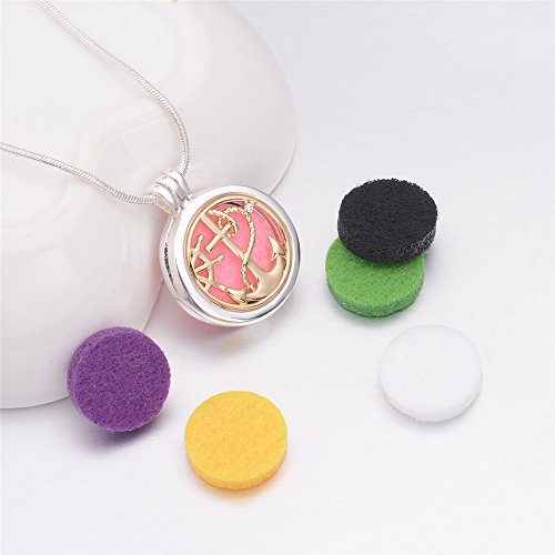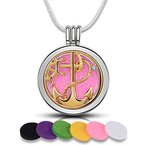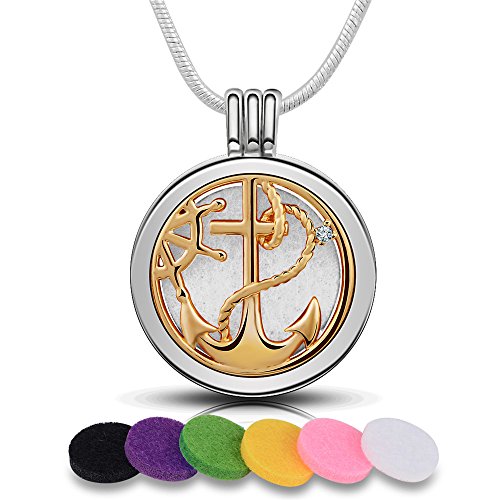 Infuse U Aromatherapy Essential Oil Diffuser Necklace Gold Ship Anchor and Rope Locket Cubic Zirconia Pendant + 6 Colors Refill Pads with 24" Snake Chain Silver Plated Scent Jewelry