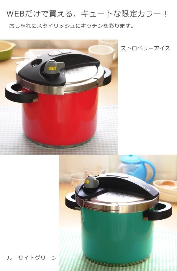 | 限定カラーの圧力鍋「オースキュート」です。こんなにキュートなカラーの圧力鍋ですが、見た目によらず日本最高クラスの超高圧でスーパー時短調理もラクラク。カレーなら加圧時間は約1分です。ふたの開け閉めは目印を合わせて回す必要がなく、ワンプッシュで簡単。ゆび1本でできます。便利なレシピ付き!キュートなカラー&時短調理で料理をもっと楽しくしませんか?プレゼントにもおすすめです。 |