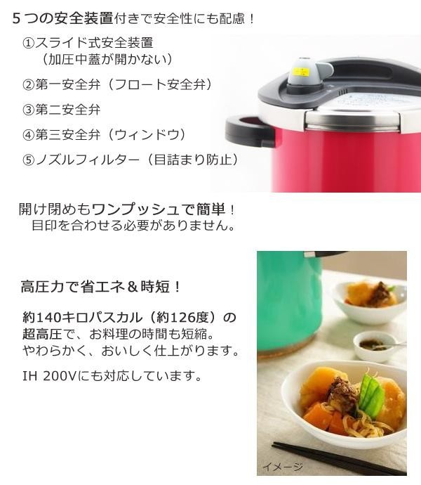 | 仕様 | 作動圧:140kPa(2.38気圧) 水の容量(最高水位線):約3.3L 水の容量(豆類線):約1.6L 白米最大炊飯量:約5合 大豆最大煮込量:約500g ガス・IH(電磁調理器)200V対応 SGマーク取得 |