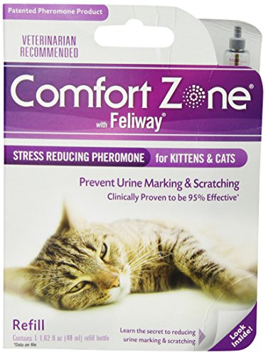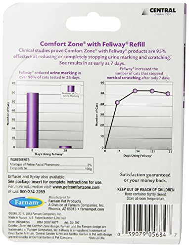 -. Feature : 3-pack of 48ml refill for the Comfort Zone Difusser / Helps your cat deal with stressful situations / Odorless and non-toxic / Mimics the comforting facial pheromone secreted by cats / Effective in elimiating urine marking