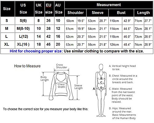 *M(US M(8-10) UK 10 EU 38 AU 12)----Shoulder 51 cm/19.9 inch----Sleeve 54 cm/21.1 inch----Chest 114 cm/44.5 inch----Length 72 cm/28.1 inch
