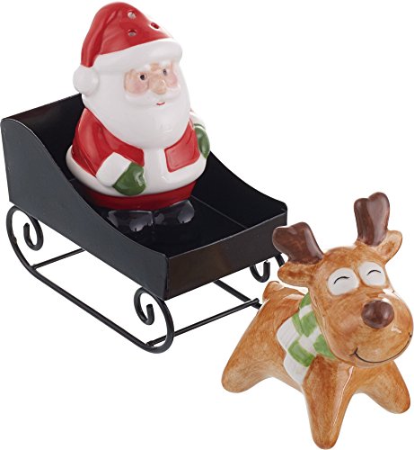 Ceramic Christmas Salt and Pepper Shaker Set - Santa, Reindeer and Metal Sleigh