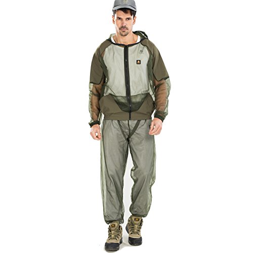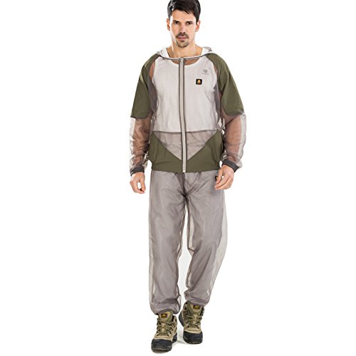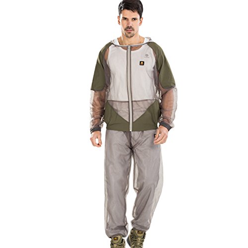 -. Feature : Treatment Repels Mosquitos / Zippered jacket, head net, and pants / Elastic at the cuffs and ankles / Suitable for hunting,fishing,camping,hiking,beekeeping and gardening / The clothes size is relatively smaller, so I recommend larger size.(one size bigger)