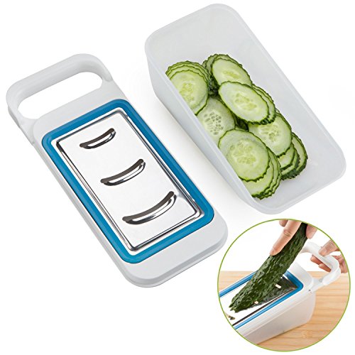 EASY TO CLEAN AND STORE: Our slicer cleans safely with water and detergent.After drying, it is ready to safely be stored as all blades fit in the container.