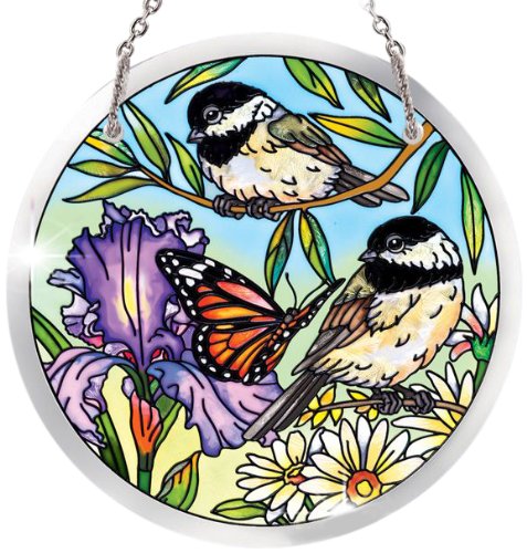 Amia 41072 Beveled Hand Painted Glass 4-1/2-Inch Circle Sun Catcher, Chickadee and Butterfly Floral Design, Medium