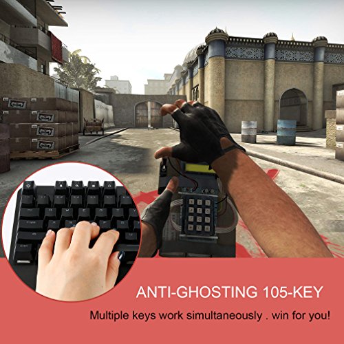 -. Feature : ◆ RED 100% MECHANICAL SWITCHES (Cherry Red Equivalent): Feature the world's leading mechanical key switch technology. Gold-Crosspoint contacts, gold-plated contact closure, and pressure resistant metal alloy springs, give every gamer the competitive advantage. / ◆ 10 KEY ROLLOVER & 100% ANTI-GHOSTING: Never miss a single key, or ten for that matter. With built-in anti-ghosting technology,you can press up to 10 keys without causing the game to crash. / ◆ FOR BOTH GAME AND GENERAL USE: Mechanical keyboards is Gaming Grade Circuitry and can minimize typos as well. Deliver smooth, linear key responses with a wide actuation zone. They have the responsiveness you need for perfectly executing double and triple taps, and there's no audible click or tactile "bump." / ◆ ERGONOMIC HIGH-LEVEL CONUOURED DESIGN: Naturally and comfortably position your fingers to reach each row of keys with high levels of contoured keycaps while you're gaming or typing. / ◆ DYNAMIC BACKLIGHTING: Three-Zone and individually backlit key with dynamic 7 colors backlighting and customized lighting effects. Brilliant LED backlighting immerses you in the game with virtually unlimited adjustability.