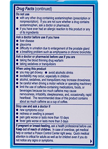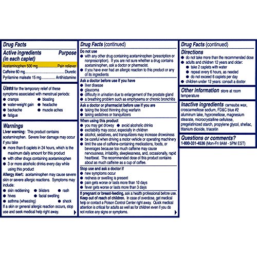 Contains 500 mg acetaminophen, 60 mg caffeine, and 15 mg pyrilamine maleate (diuretic)