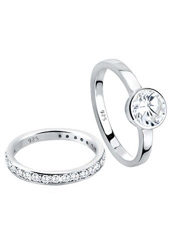 -. Feature : Hochwertiger Ring aus 925er Sterling Silber (FEINGEHALTSTEMPEL 925), anlaufgeschützt, hochglanzpoliert und das ideale Geschenk für Damen. / Einzigartiger Schmuck mit echten ZIRKONIA KRISTALLEN, traumhaft funkelnd. Schmucksteine sind die glamouröse Alternative zu echten Diamanten. / Ausdrucksstarker Fingerschmuck ist das Symbol für Ewigkeit und damit ECHTSCHMUCK voller Persönlichkeit und Bedeutung. / Einzeln faszinierend, zusammen traumhaft schön. Zwei elegante 925er Sterling Silber Ringe im Set - einzeln oder zusammen tragbar. 1 Ring besetzt mit 25 weißen Zirkonia (1.5mm) in Kanalfassung. 1 Ring mit großem, funkelnde Zirkonia in weiß, Ø ca. 6 mm. Alle Ringe hochglanzpoliert und in hochwertiger Juweliersqualität gearbeitet.