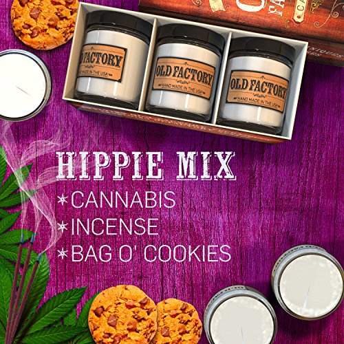 - HIPPIE MIX themed gift set contains 3 different 4 ounce candles. Scents include Cannabis, Incense, Bag O' Cookies.