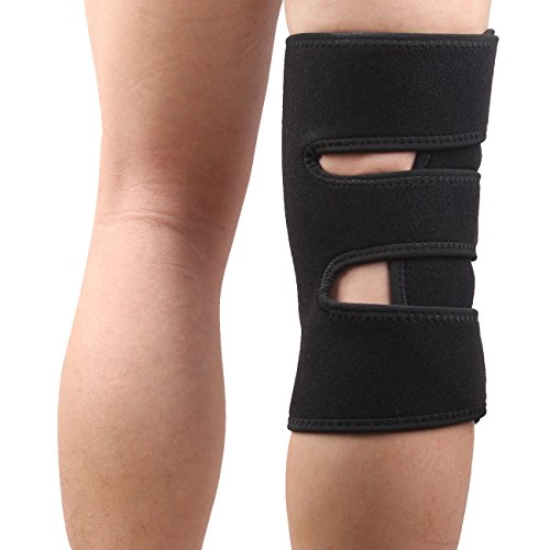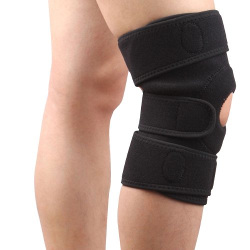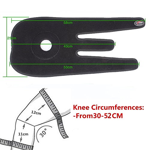 -. Feature : Breathable neoprene wraparound knee support brace with moisture-wicking ability, which is a good choice for workout. Breathable material will draw moisture from the skin to prevent painful blisters which may occurred during heavy usage due to rubbing of fabric on moisture. It gives a bit of warmth to your knee without a build-up of sweat. / Fully adjustable Knee Brace. With three strong velcro straps, it could fits most knees with the circumferences of 30-52CM. Size in XL, with a width of 24CM, total length of 55CM. While you wrap the knee brace on your knee, it could be wrap around your knee with a custom fit and self controlled compression. / Incorporates patellar stabilizers & lateral stabilizers to ensure keeping the patellar in place whenever your knee moves with the motion range. While runs or workouts, if the knee cap or patella does not track properly in the thighbone or fr's groove, its friction leads to pain or injuries. This patellar knee brace provides you the basic support to keep the patellar in place. It provides a Flannel bags can be repeated use. / Open patella knee support design which is with a cutout for the kneecap, it is designed to put pressure through the patella tendon and support the kneecap, therefore improving patellar tracking or kneecap movement. This design can help keep the bone in place and ease pain which is caused by weakness or softness of cartilage under the kneecap, relief the pressures on the kneecap and reduce fatigue of knee joint from intense exercises and heavy workout. / 100% Satisfaction Guarantee: If you are not completely satisfied with our product for any reason, just let us know and we'll refund you in full. Take advantage of our special offer now and order your knee support, totally risk free