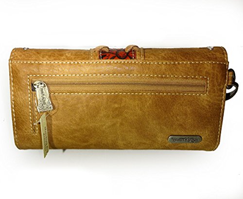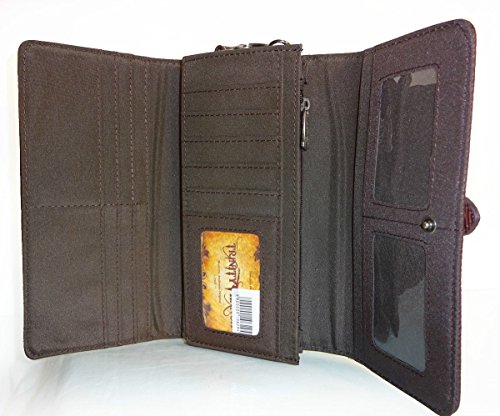 Studio : Western Fashion Publisher : Western Fashion Binding : Apparel Product Description Trinity Ranch® Tri-fold Wristlet Wallet w/ Tooled Leather Accents- Brown TR36 Wallet Measures: Length: 7.5 Height: 4 Depth: 1 7 Wristlet - Floral tooled design on genuine leather - Pu Leather Trim Backing (PU leather: leather particles coated in Polyurethane or a thin layer of leather coated in Polyurethane) *Silver Concho on Flap, Silver-tone Hardware and Studding - Zipper pocket on back plus Trinity Ranch Logo Plate Inside: - 3 Id Slots, 11 Card Slots, 2 bill Slots, 2 compartments with Zipper Pocket in Center