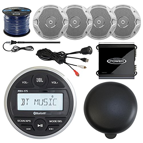 JBL PRV-175 Guage Style AM/FM USB Bluetooth Marine Radio 4 X 6.5" JBL Marine Speakers & Speaker Wire, Milennia Marine 2 Channel Amp, Enrock Universal USB AUX Input, Stereo Cover, Antenna (4 Speakers)