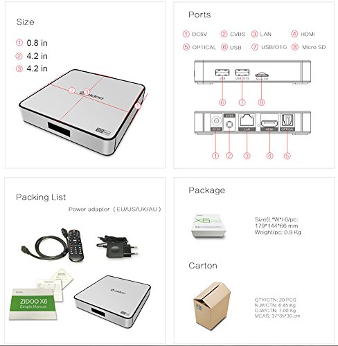 -. LegalDisclaimer : Perfect Configuration:Based on Android 5.1,Powered by Cortex-A53 Rockchip 3368 Octa-core CPU,2G/16G make big games run more smoothly,802.11ac dual-band WIFI,1000M network interface carefreely shows in front of audience with 10 times speed through current mainstream 100M ,without any pressure limit. Fantastic ZIUI:ZIUI is based on android system,you can have simple APP management,easily find video music pictures file and no need exchange from different APP,support setting passcode of any APP. For Watching:ZIDOO X6 Pro offers 4K*2K H.265 Hardware Decoding UHD video playback,support 4K@60fps HD Audio(7.1CH) passthrough,24P frame rate auto switch,Pre-installed ZDMC(Based Upon Kodi 15.1),support hardware decoding,Support BD iso,BDMV,BD rip,BD 3D MVC format playback on video player and kodi. RC & IR Shortcut:Through ZIDOO RC,you can use your favorite operating way to control X6 Pro with your cell phone.The new smart IR remote with progrmmable keys offers a great easy way to control not only the X6 Pro but also the TV at your home,It also supports three programmable color-keys that customizes to open apps quickly. OTA:We use the global CDN services,and will have actively firmware update,but first will in our forum to gray scale test for some days,when we confirm it stable will push OTA online update,if find some big bugs need update,we will update new firmware asap and test it again.These make sure the firmware OTA to our customers make much better use.(Customers can download our new firmware from our forum to update also)