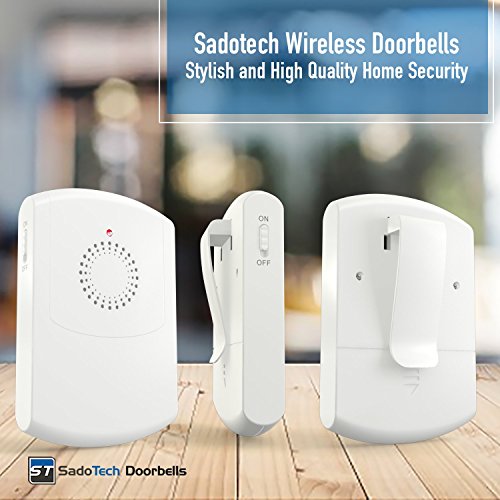 SadoTech Flashing Wireless Doorbell with Portable Vibrating Receiver (with belt clip), Transmitter Button and Plugin Flashing Receiver Operating at 500-feet Range with Over 50 Chimes, Model H (White)