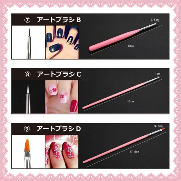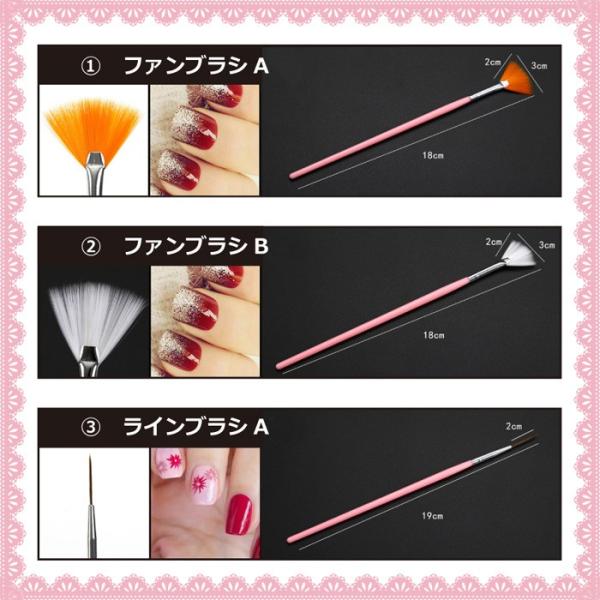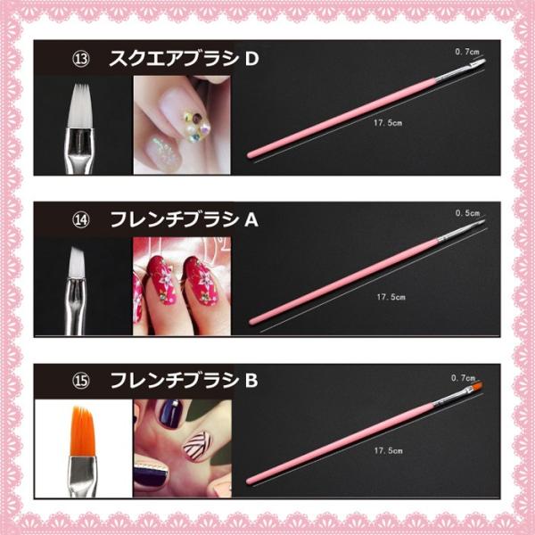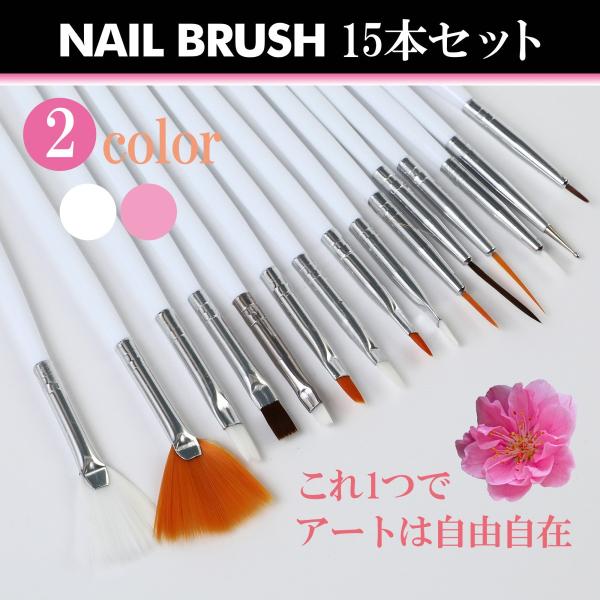 ジェルネイル使えるブラシ15本セットネイルアート用ブラシのセットです。ドットペン・ジェルブラシ入り。全部で15本の超お得セット!パッケージ内容 1.ドットペン 2.平筆大 3.平筆大2 4.平筆中 5.平筆小 6.フレンチブラシ大 7.フレンチブラシ小 8.ラインブラシ1 9.ラインブラシ210.ラインブラシ311.アートブラシ112.アートブラシ213.アートブラシ314.ファンブラシ115.ファンブラシ2※他にもジェルネイル用のLEDライトやスタンプなど色々取り揃えています。■カラーホワイト・ピンク