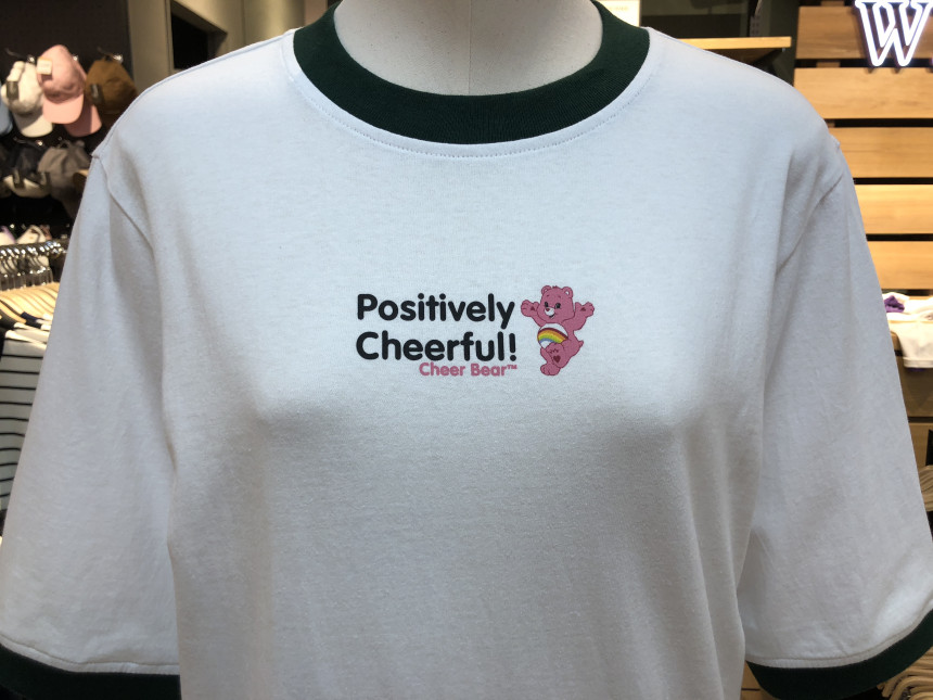 기쁨을 찾게 해주는 케어베어의 메세지를 왼쪽 가슴에