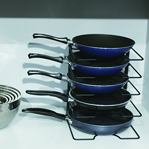 The pot lid organizer designed with five compartments is perfect for storing pots, pans, bakeware and cutting board of different sizes saving you a lot of kitchen cabinet space.