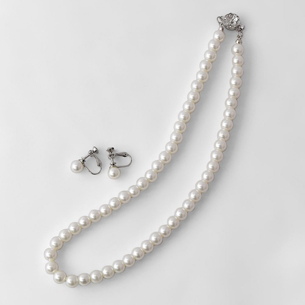 ● Pearl necklace and earrings, large glass pearls of about 9 mm shine cleanly,