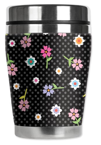 Mugzie Flowers & Polka Dots "Mini" Travel Mug with Insulated Wetsuit Cover, 12 oz, Black