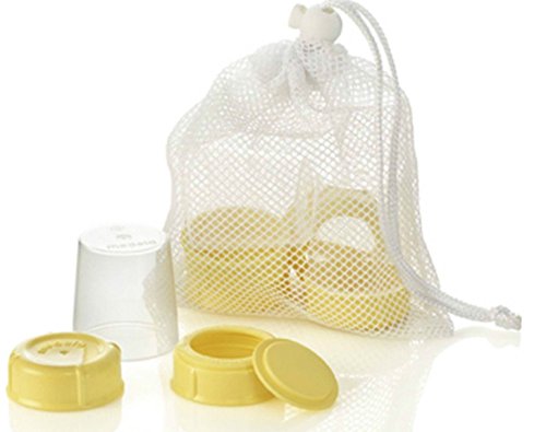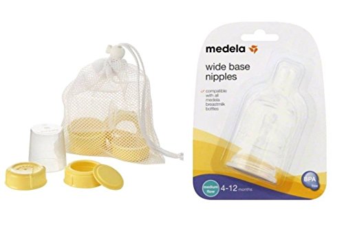 - Feature : Spare parts and nipples are compatible with all Medela breast milk bottles. / Three medium-flow silicone nipples with natural feel and shape. / Comes with convenient mesh bag for keeping parts together. / BPA-Free. / Contains: (3) travel caps; (3) collars; (3) discs; (3) solid lids; (3) wide-base, medium flow nipples and (1) mesh